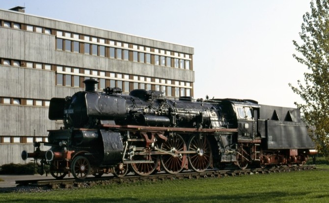 Bild unten: Ihren endgültigen Platz nahm die Lok April 1972 vor der Fachhochschule in Offenburg ein, wo sie bis heute zu bewundern ist. Copyright: Will A. Reed / Slg. Eisenbahnstiftung