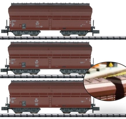 Die neuen MINITRIX Modelle bilden zunächst zwei dieser Varianten ab. Die komplette Neukonstruktion ist äußerst filigran ausgeführt. Das 3er Set gibt drei gebremste Wagen mit bzw. ohne Bremserhaus wieder.
